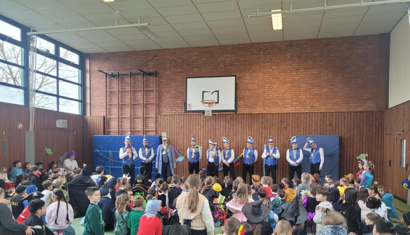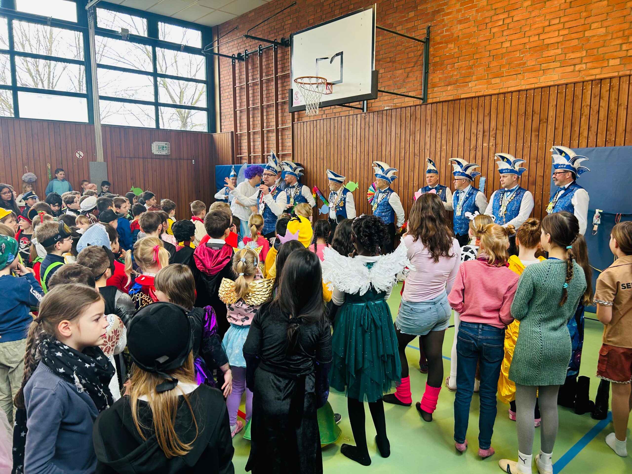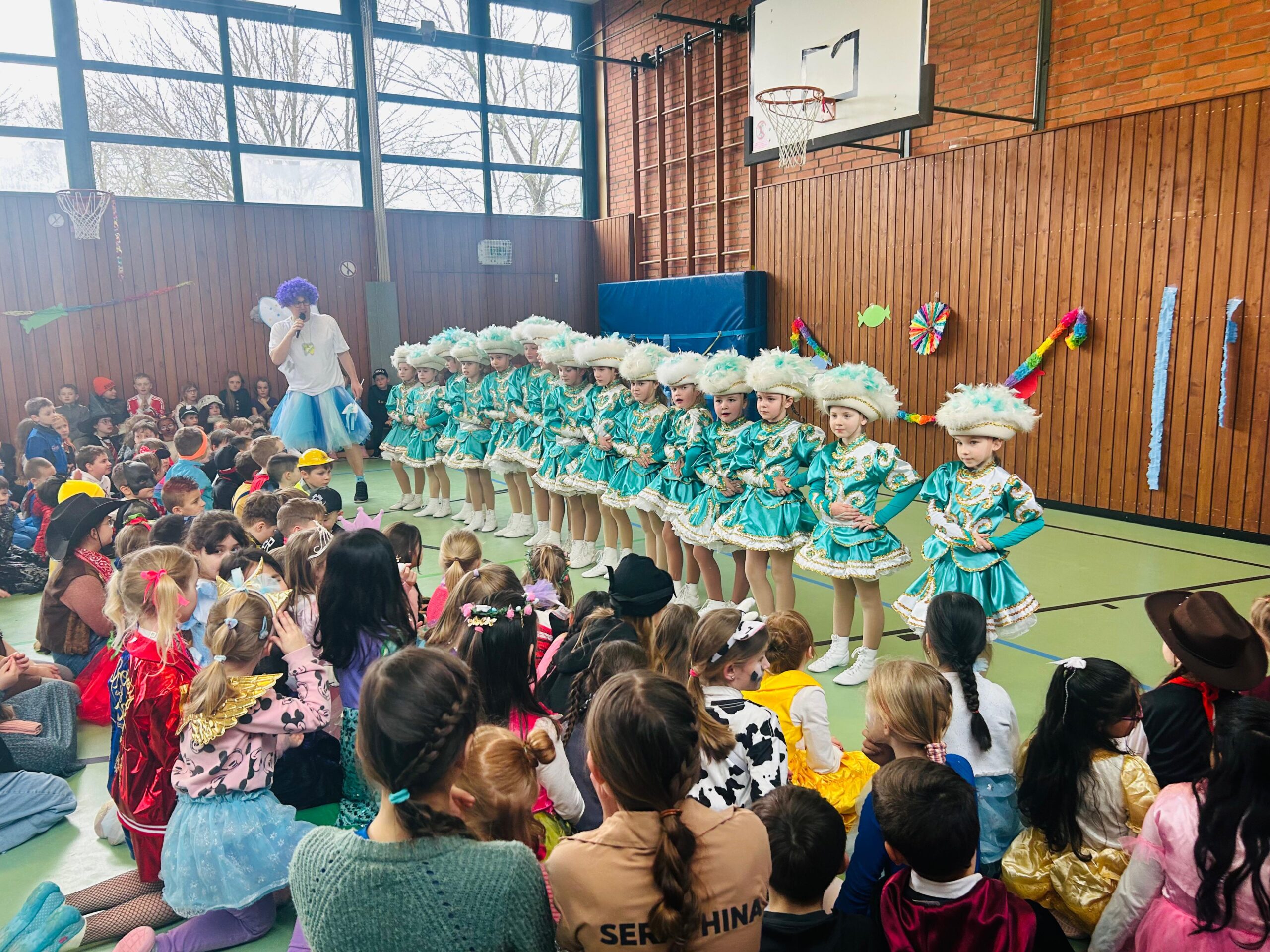 Nach Spiel und Spaß in den jeweiligen Klassen fand die gemeinsame „große Party“ in der Turnhalle statt. Neben tollen Tanzauftritten, lauter Musik und bunten Kostümen, besuchte uns auch in diesem Jahr wieder die HKG mit ihrem Gaalbernschauden! – „Gaalbern – hinein“